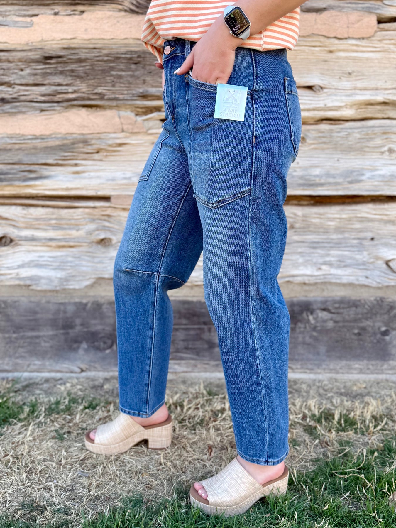 The Clover Mid Rise Patch Pocket Barrel Jean by Risen brings trendy style to your closet. With a mid-rise waist, relaxed barrel fit, and cute patch pockets, these jeans are designed for comfort while remaining trend forward. The darker wash keeps them polished, great for casual Fridays and weekend adventures!