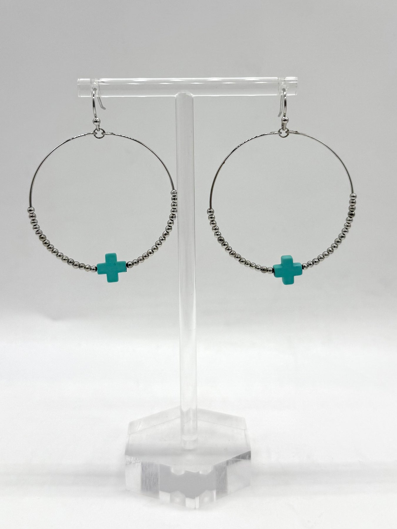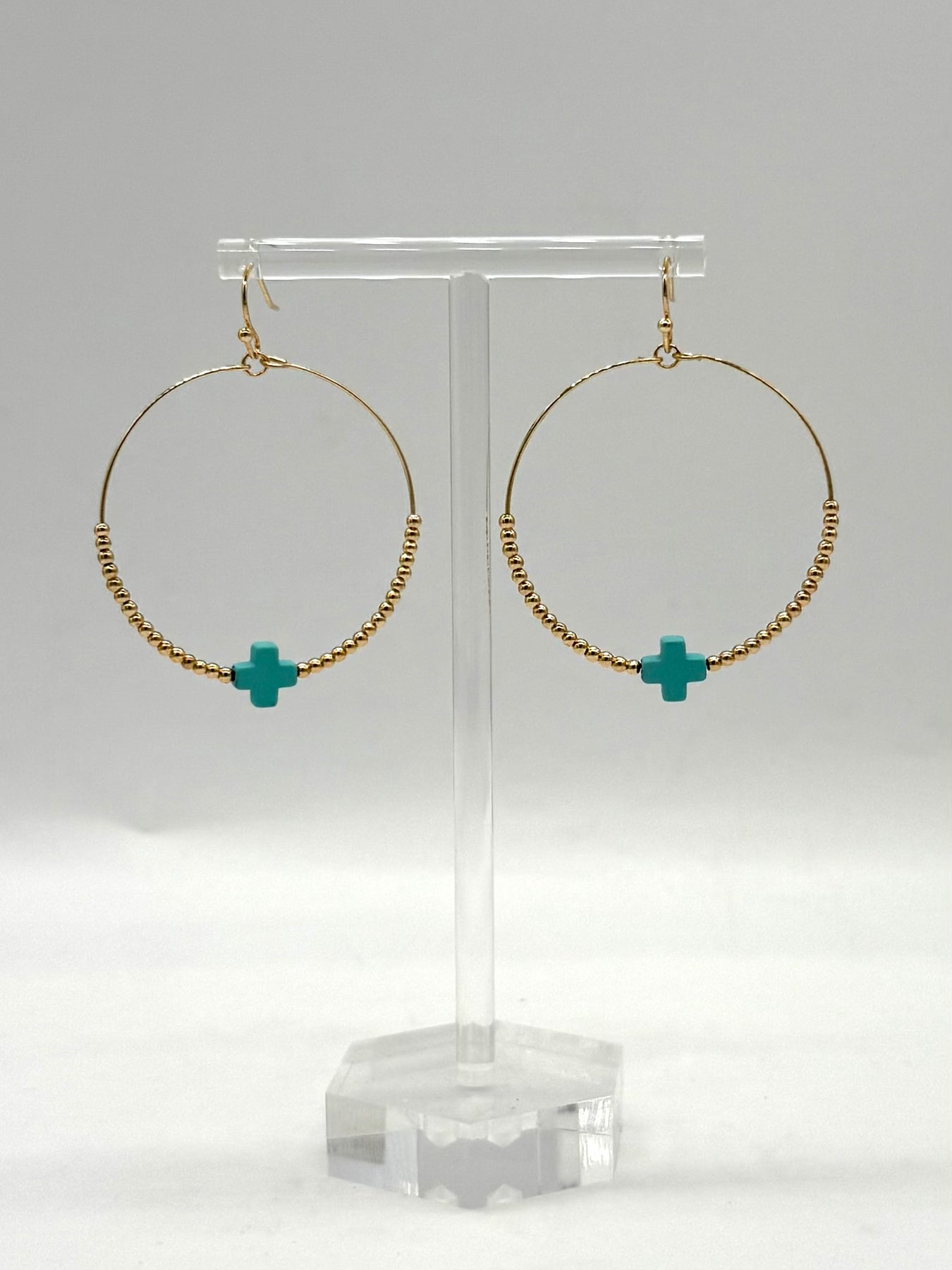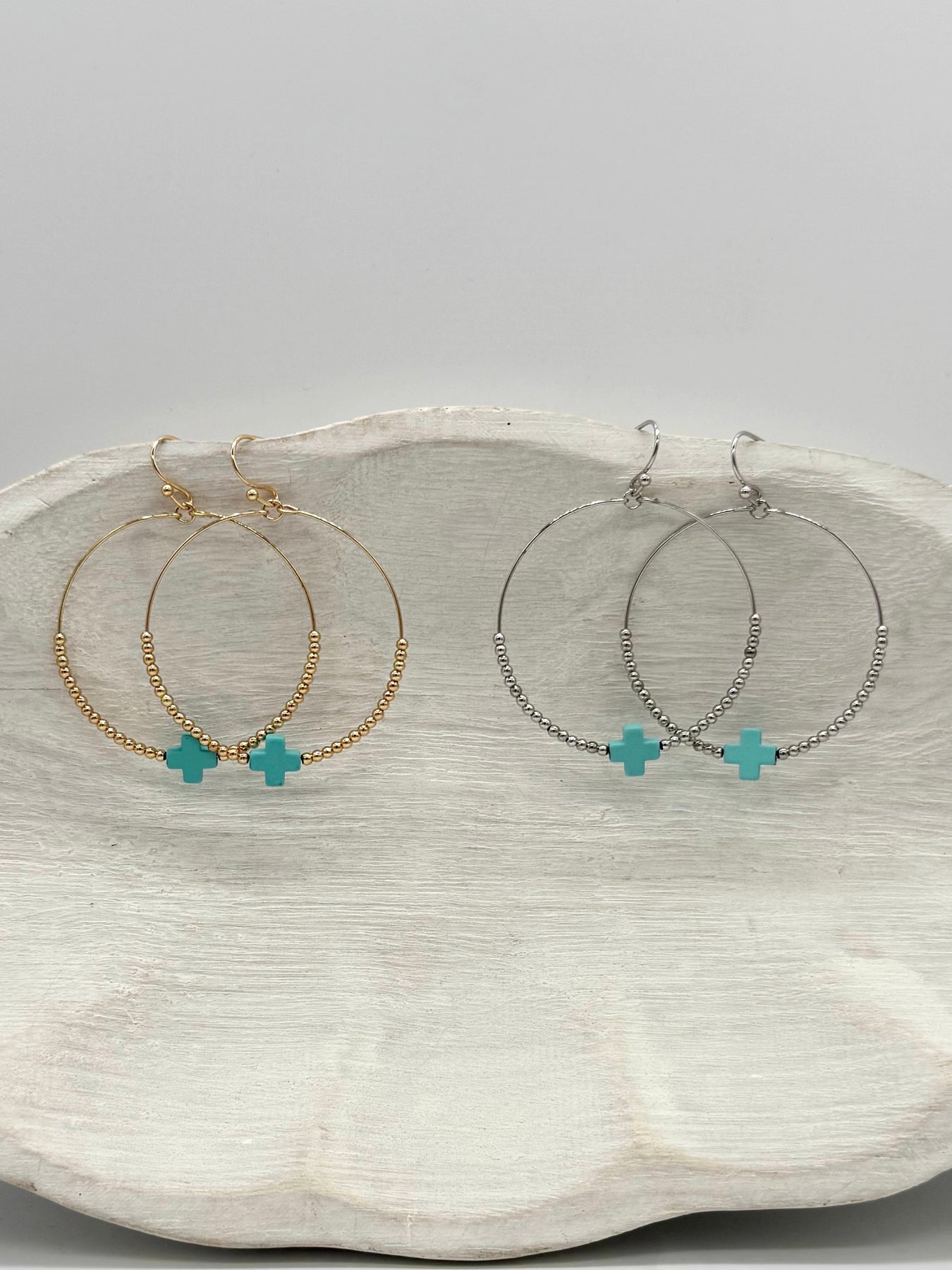 These Grant Turquoise Cross Hoop Earrings are here just in time for Summer! Available in Gold or Silver, these beaded beauties pair effortlessly with the turquoise cross accents. These are perfect to dress up any outfit and we love the how the finishes pop!