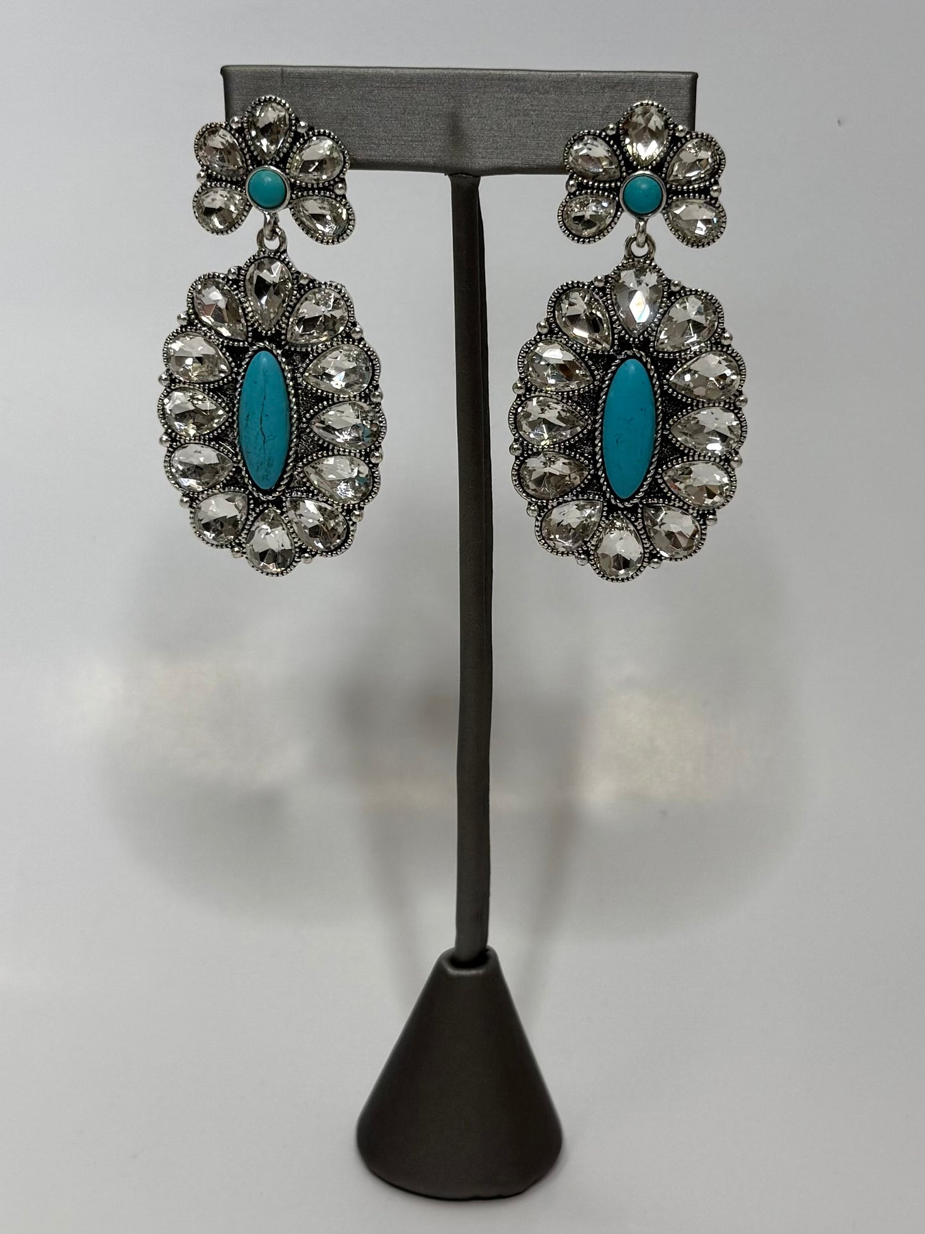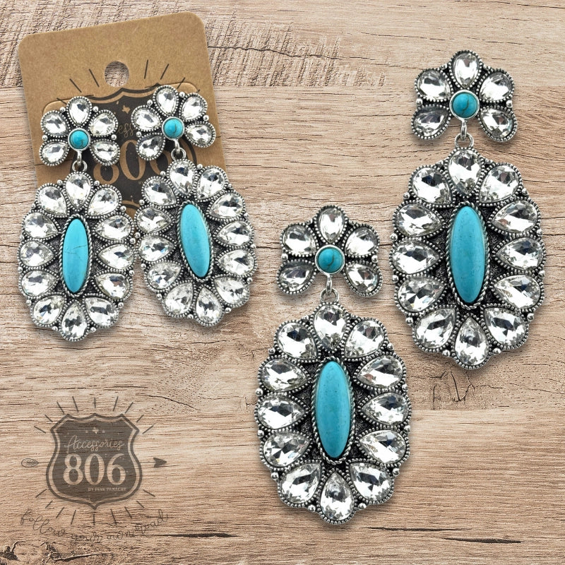 These eye-catching concho earrings feature a gorgeous turquoise stone at the center, framed by a dazzling ring of rhinestones in a charming teardrop silhouette. Perfect for adding a pop of color and sparkle to any outfit!