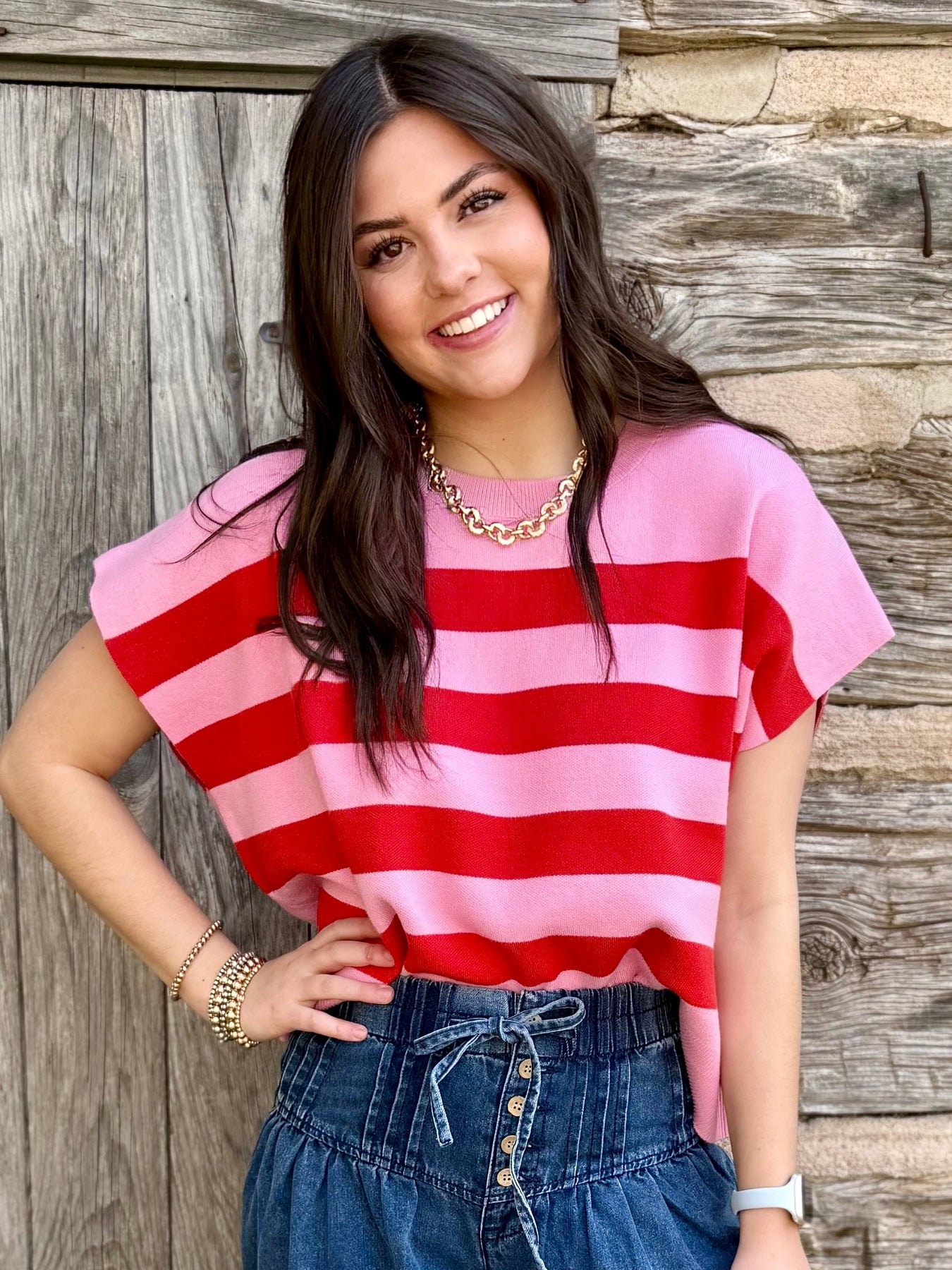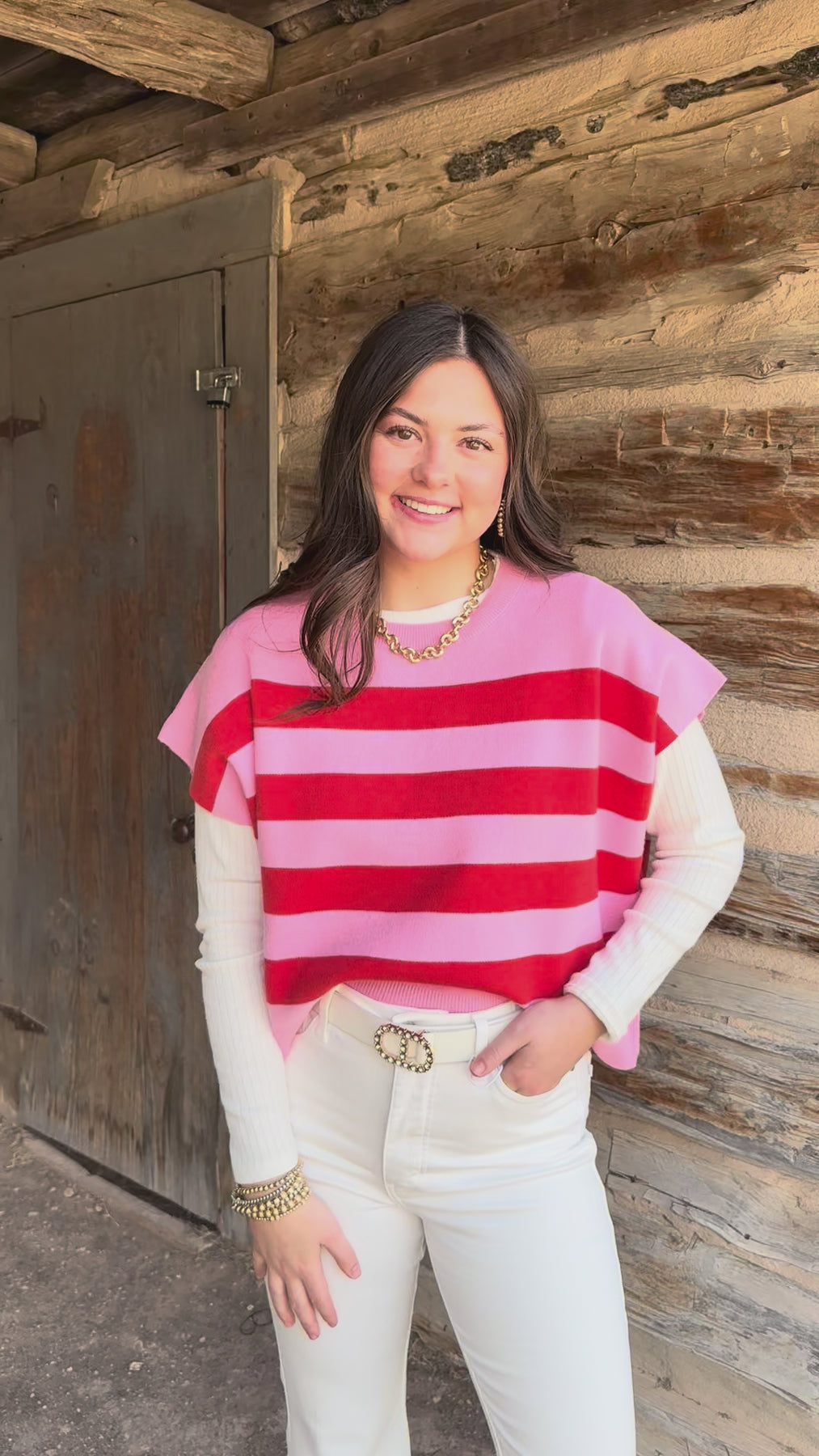 Introducing the Cherry Pop Pink Striped Sweater, it's the perfect combination of comfort and style! This adorable sweater is sleeveless, making it easy to layer and perfect for any occasion. We have it styled with both white and dark denim...sleeveless and layered just to show how cute it is! Stay fashionable while passing time in this versatile piece.