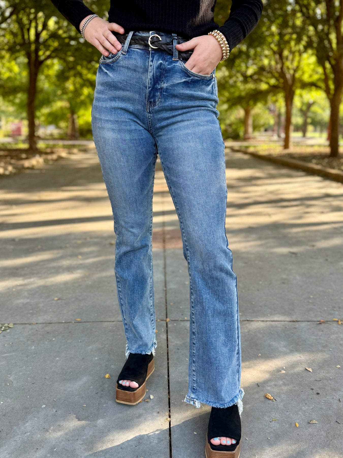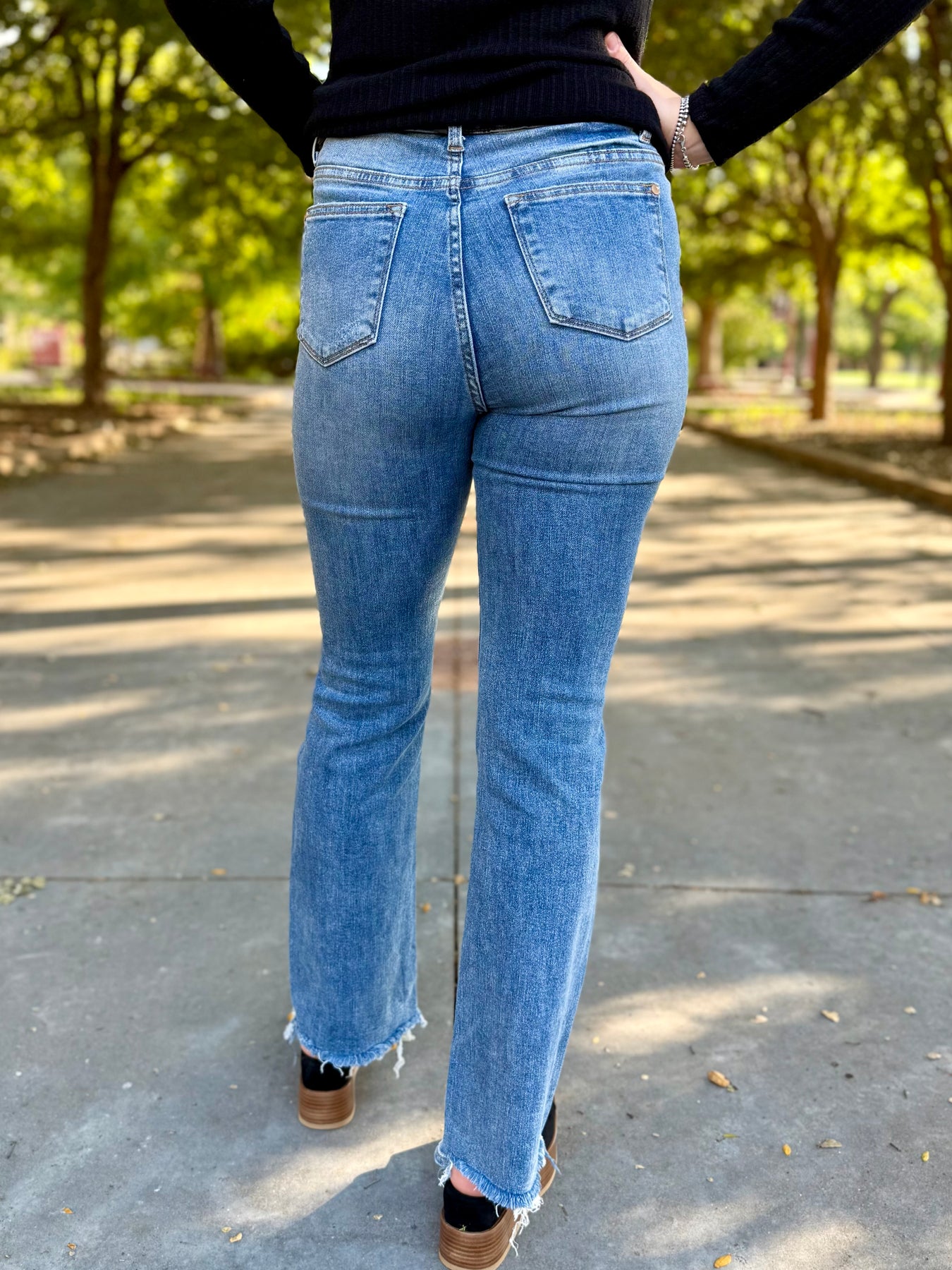 Get ready to elevate your denim game with the Evie High Rise Boot Cut Jean by Judy Blue. This versatile medium wash jean is easy to style and can be dressed up or down. The double button and destroyed hem add character. Pair with a  graphic tee or sweater for an easy going fall outfit.