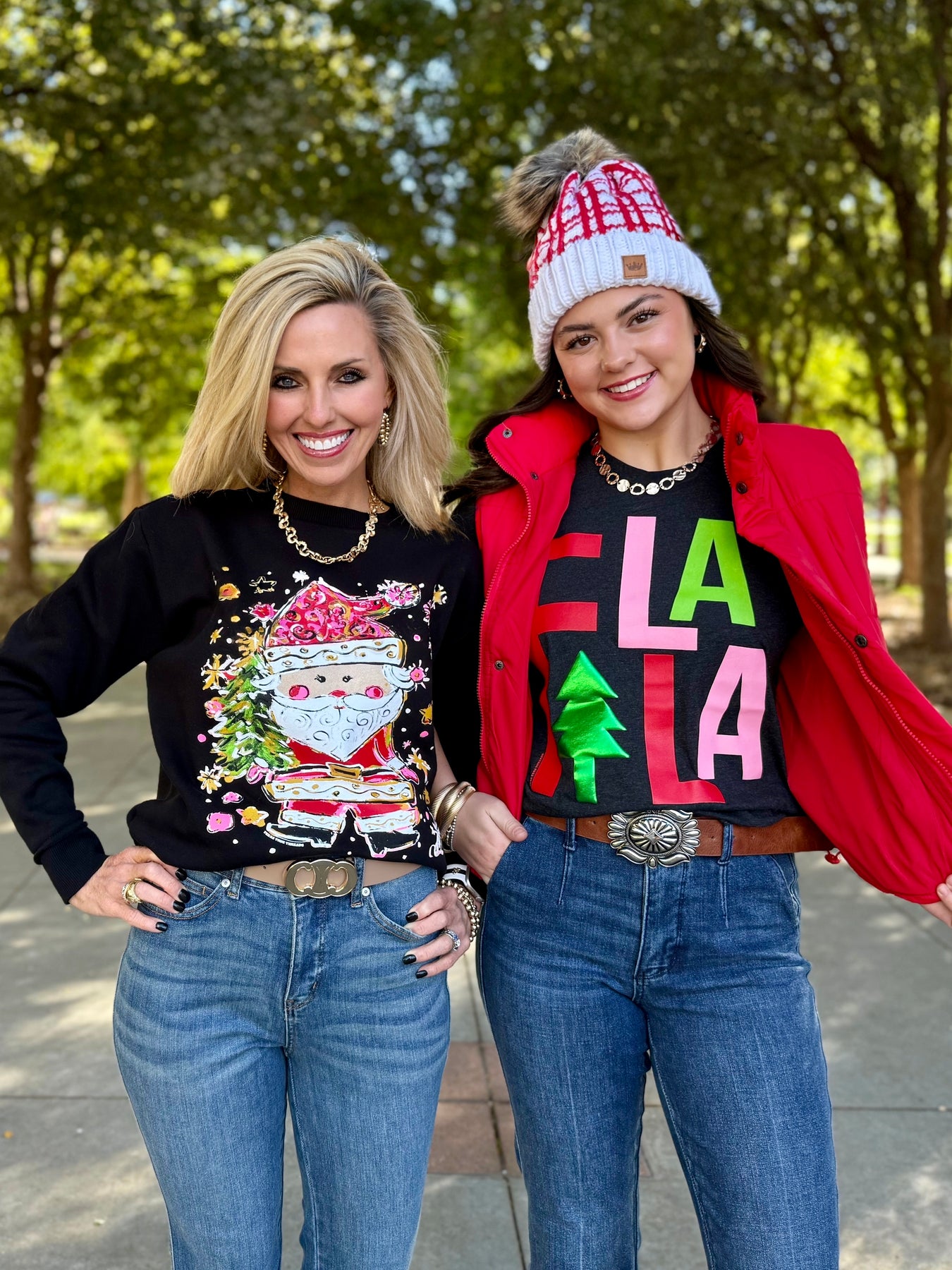 This new FA LA LA design comes in a fun multicolor combo, and it's too cute to pass up! The green puff tree adds to the fun of the design. The bright colors pop against this char black tee.