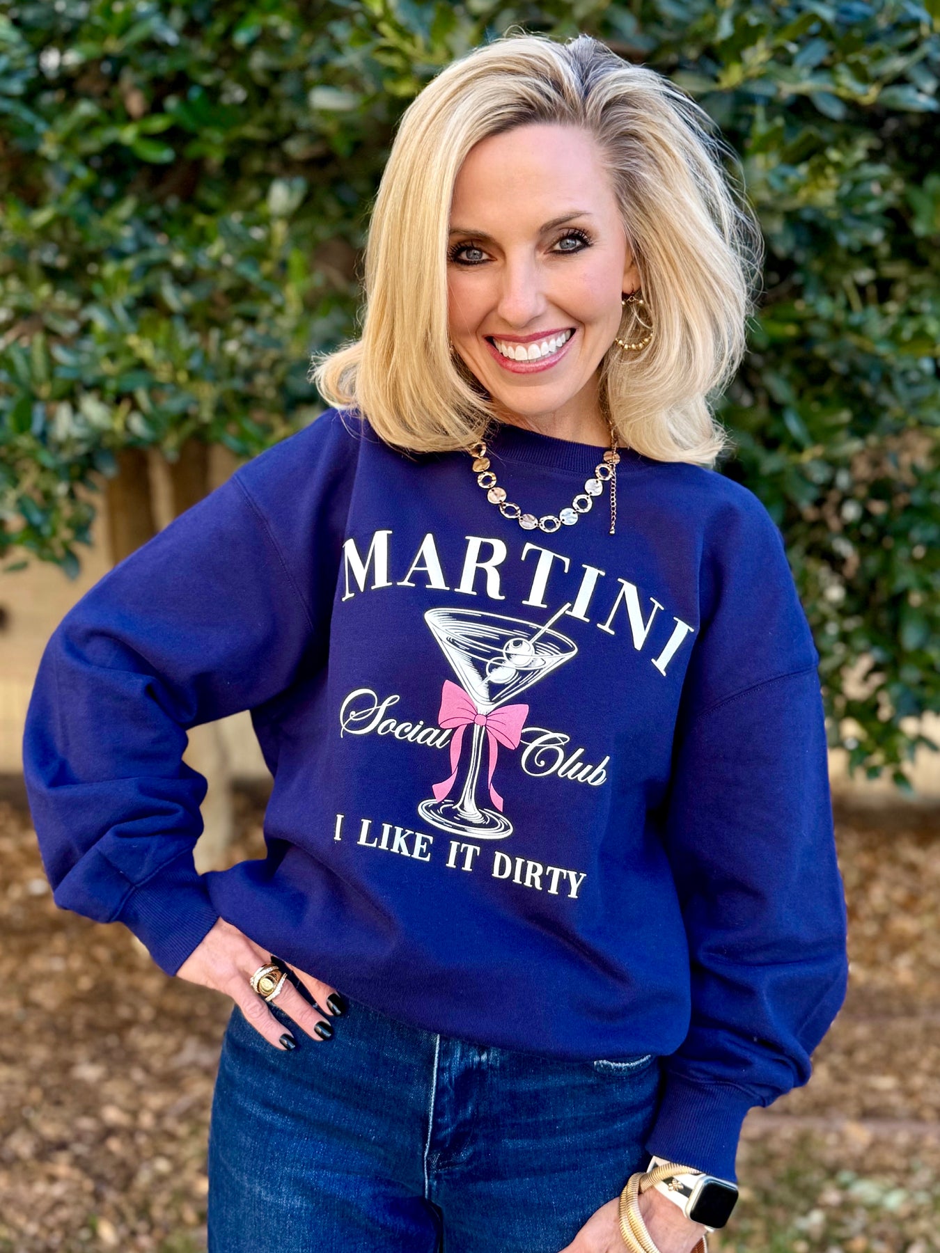 The Martini Social Club Sweatshirt is for all our martini lovers, your new go-to for cozy nights and casual days. With its classic navy color and fun bow tied martini glass detail, it’s the perfect mix of laid-back comfort and playful style.