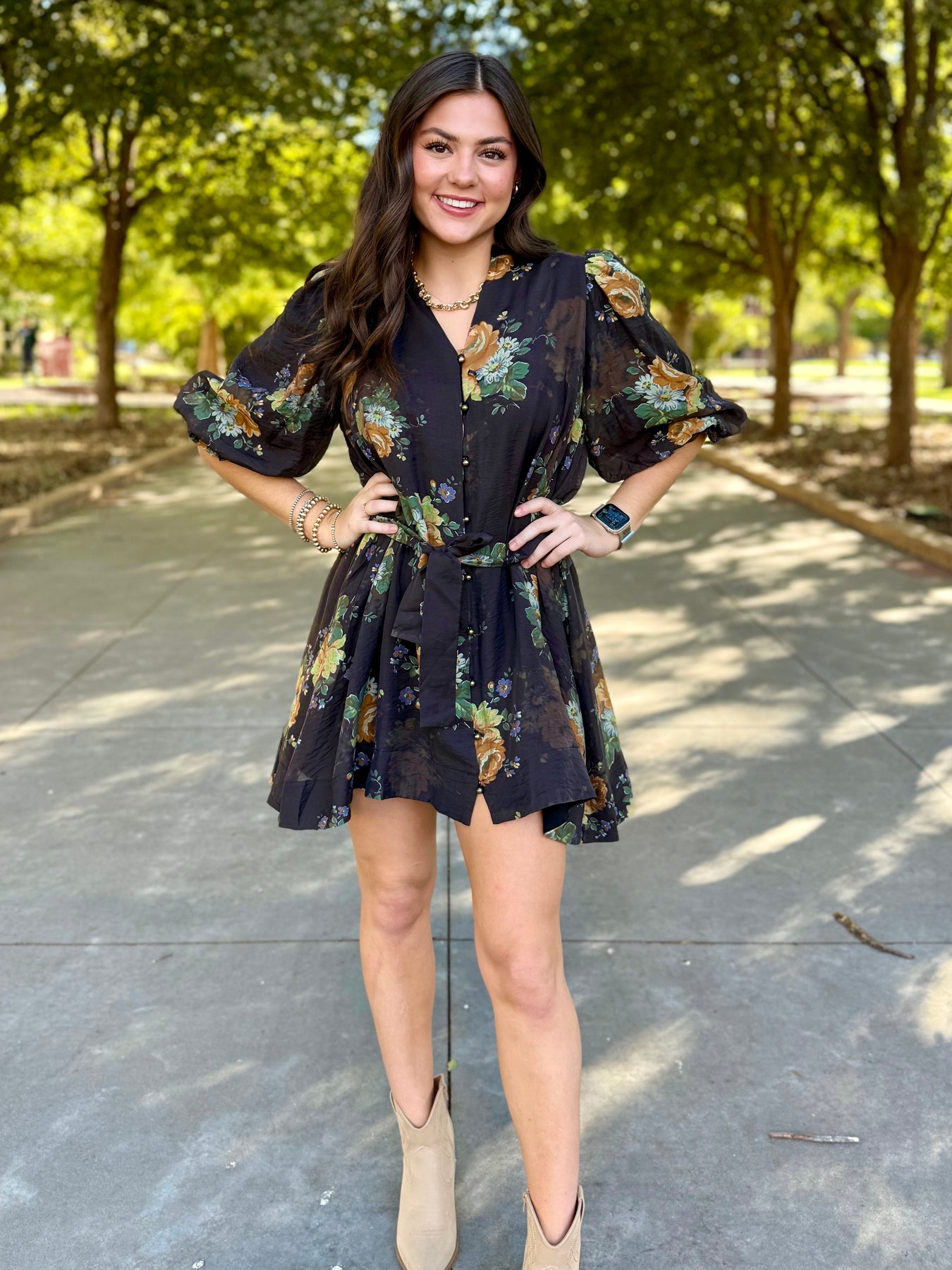 The Soft Shaded Floral Dress is fall at its finest! This chocolate brown statement maker is fully lined, has balloon sleeves, a v-neckline, and a tie at the waist. The beautiful flowers in warm tones will you make you think of golden hour light. Pair this dress with a tall boot for an elegant fall wedding look.