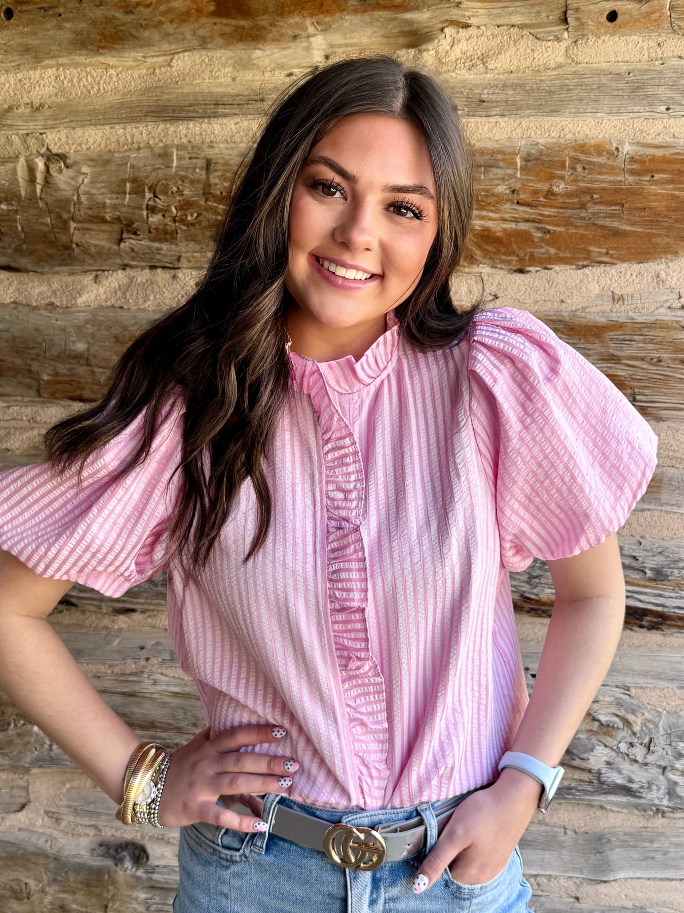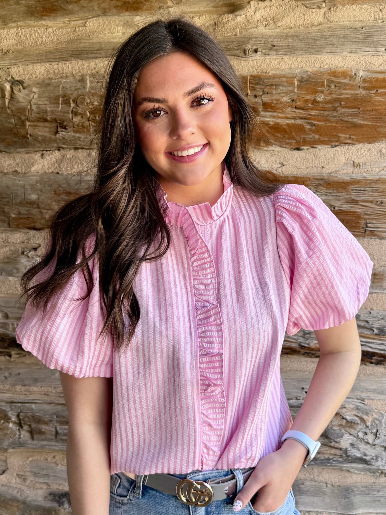 The Sweet Magnolia Pink Seersucker Blouse is a fresh, yet classic Spring blouse. Featuring playful seersucker fabric and a lightweight feel, it’s easy to wear while still making a statement. Style it with light or medium wash denim or white jeans. We think it's a sweet Spring outfit, ideal for patio dining!