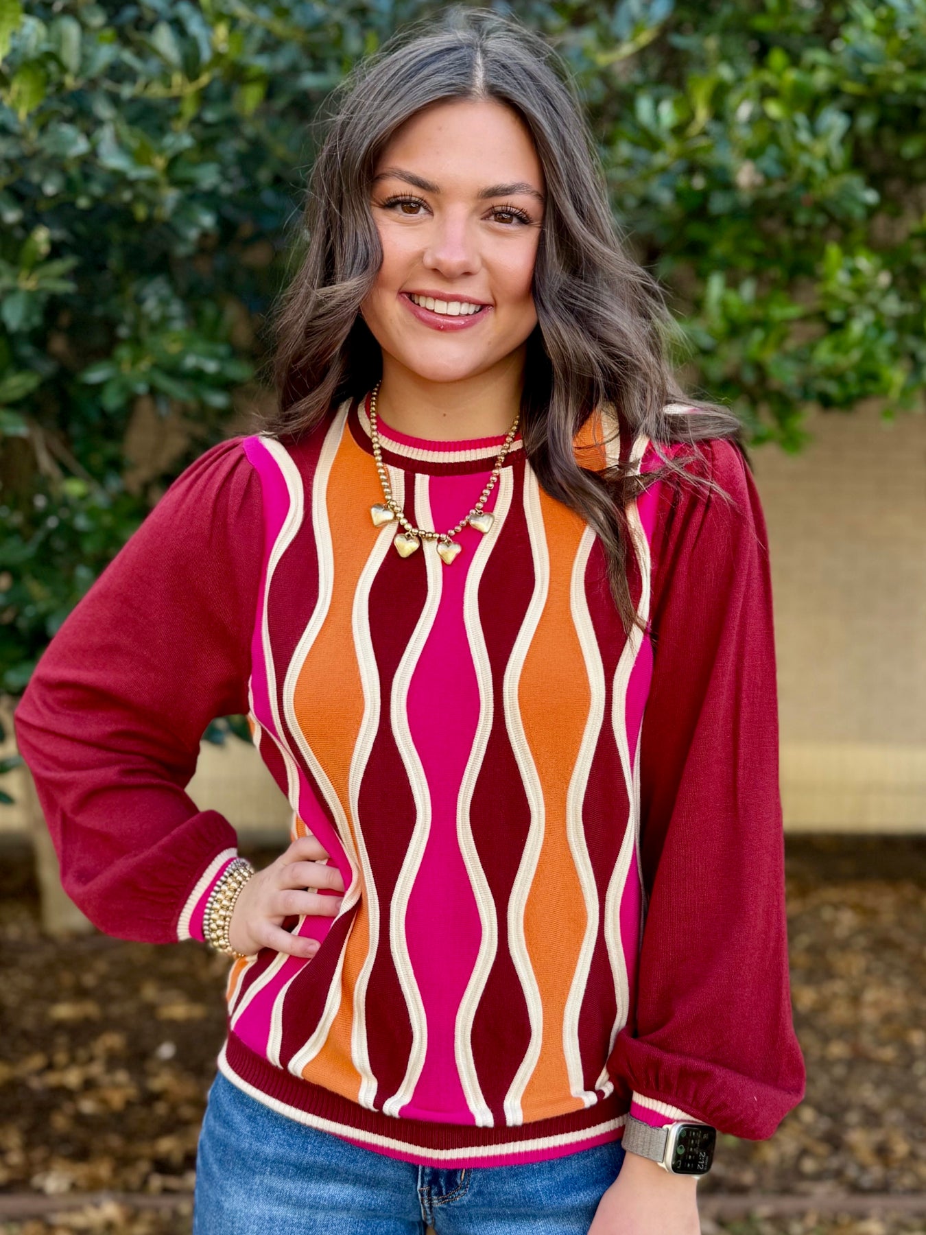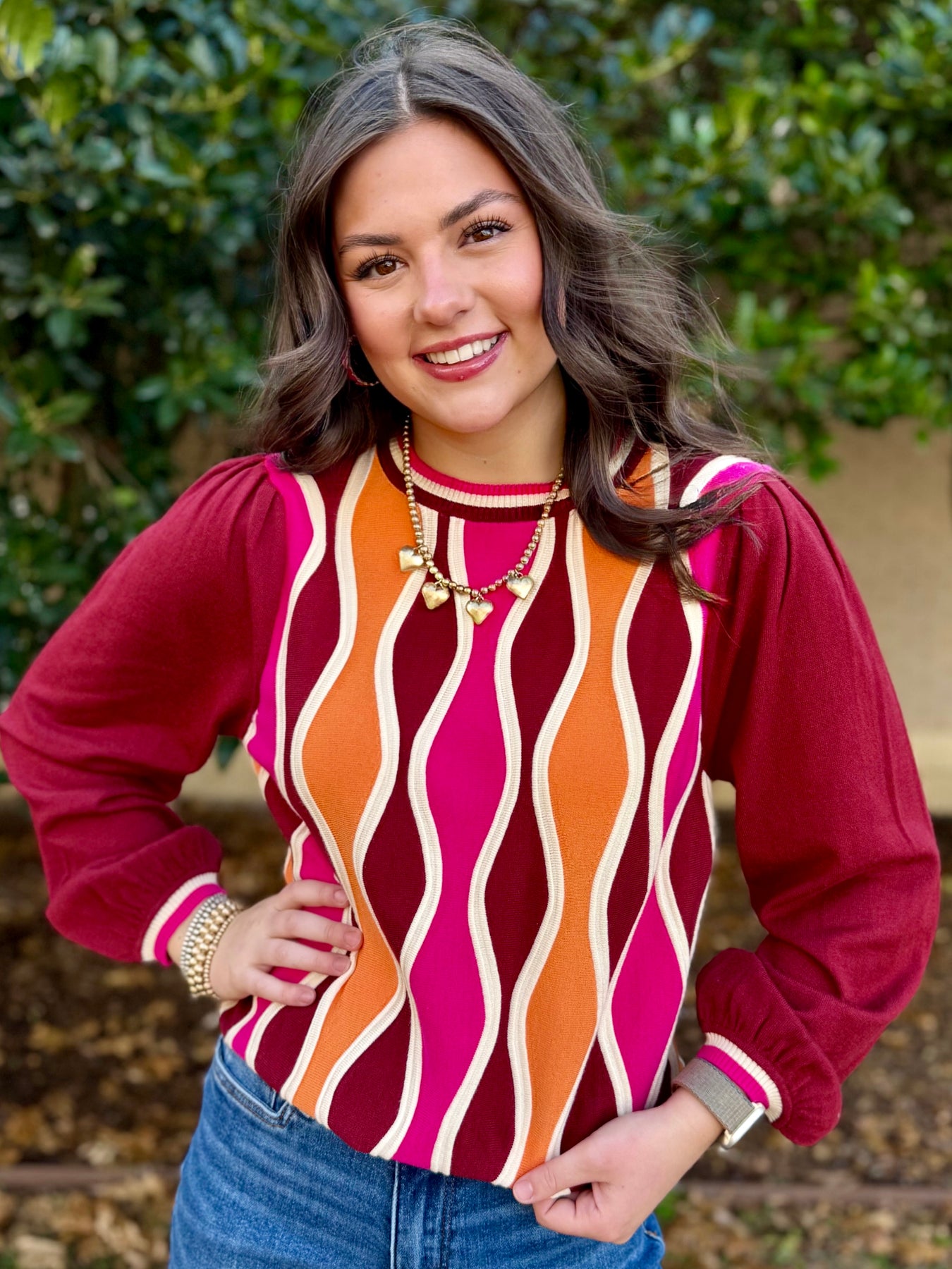 Dress in retro vibes with the Whitney Multi Sweater—a playful blend of bold colors that demands attention. The striking wine sleeves pop against a vibrant orange and fuchsia bodice, while dreamy balloon sleeves and a classic round neckline keep things effortlessly chic. Throw it on with your go-to jeans and you've got the perfect recipe for a night out that feels both fun and put-together.