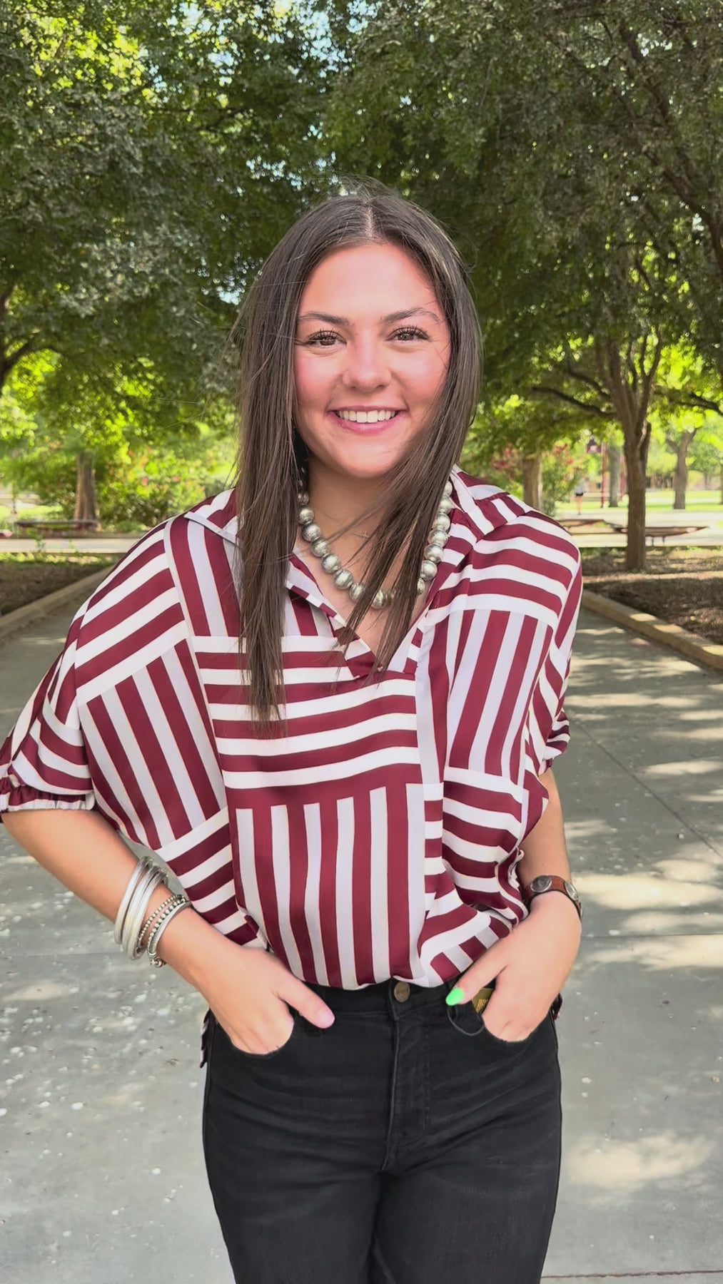 When repping the team is a priority, grab a blouse that makes cheering easy! This new Sloane Maroon V-Neck Blouse showcases a gorgeous stripe print and is very high quality. Ideal for the upcoming fall season, this blouse is ideal for cheering On, On, Buffaloes!