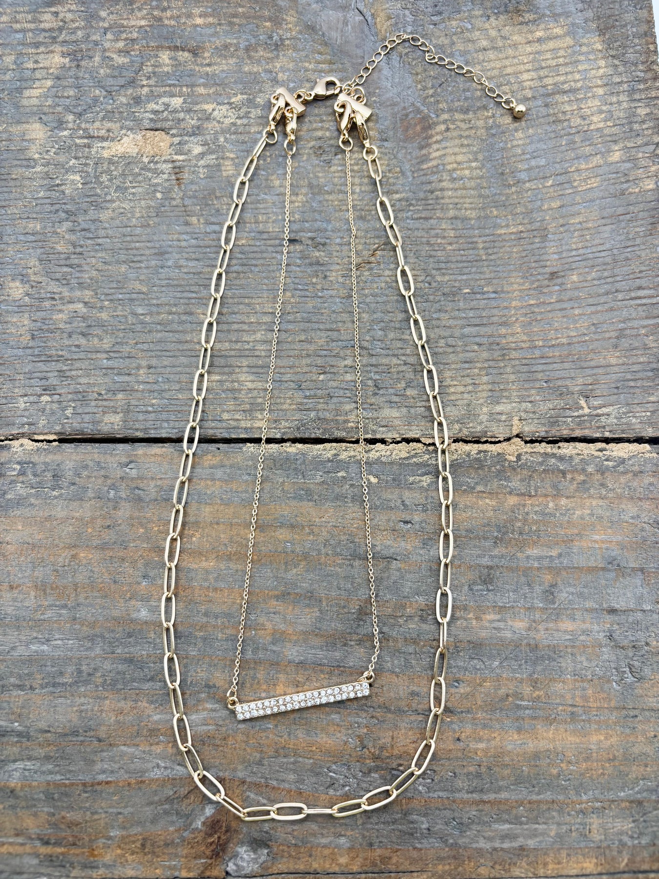 Sparkle up any outfit with this gorgeous layered necklace! Featuring shimmering rhinestones and gold tones, it's the perfect mix of glam and wearable style. Dress it up or down—this beauty works for everything. Can be worn layered together or individually with its unique builtin necklace separator.