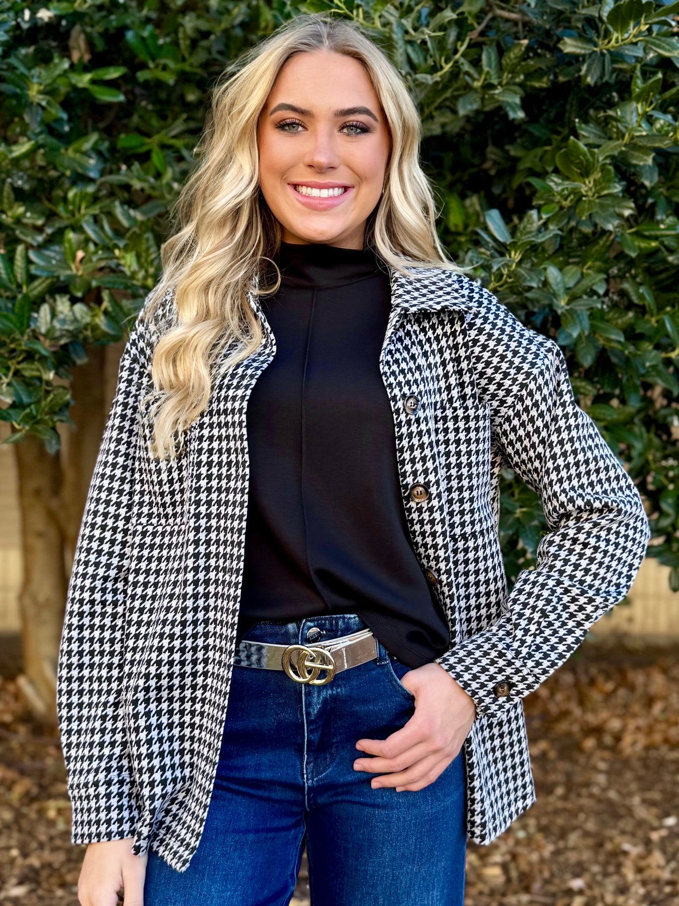 Layer up with style in this cozy houndstooth shacket. The classic black and grey pattern brings timeless appeal, while the soft knit fabric keeps you comfortable all day long. Perfect for spinning through your week in chic, casual comfort—dress it up or down, this versatile piece does it all.