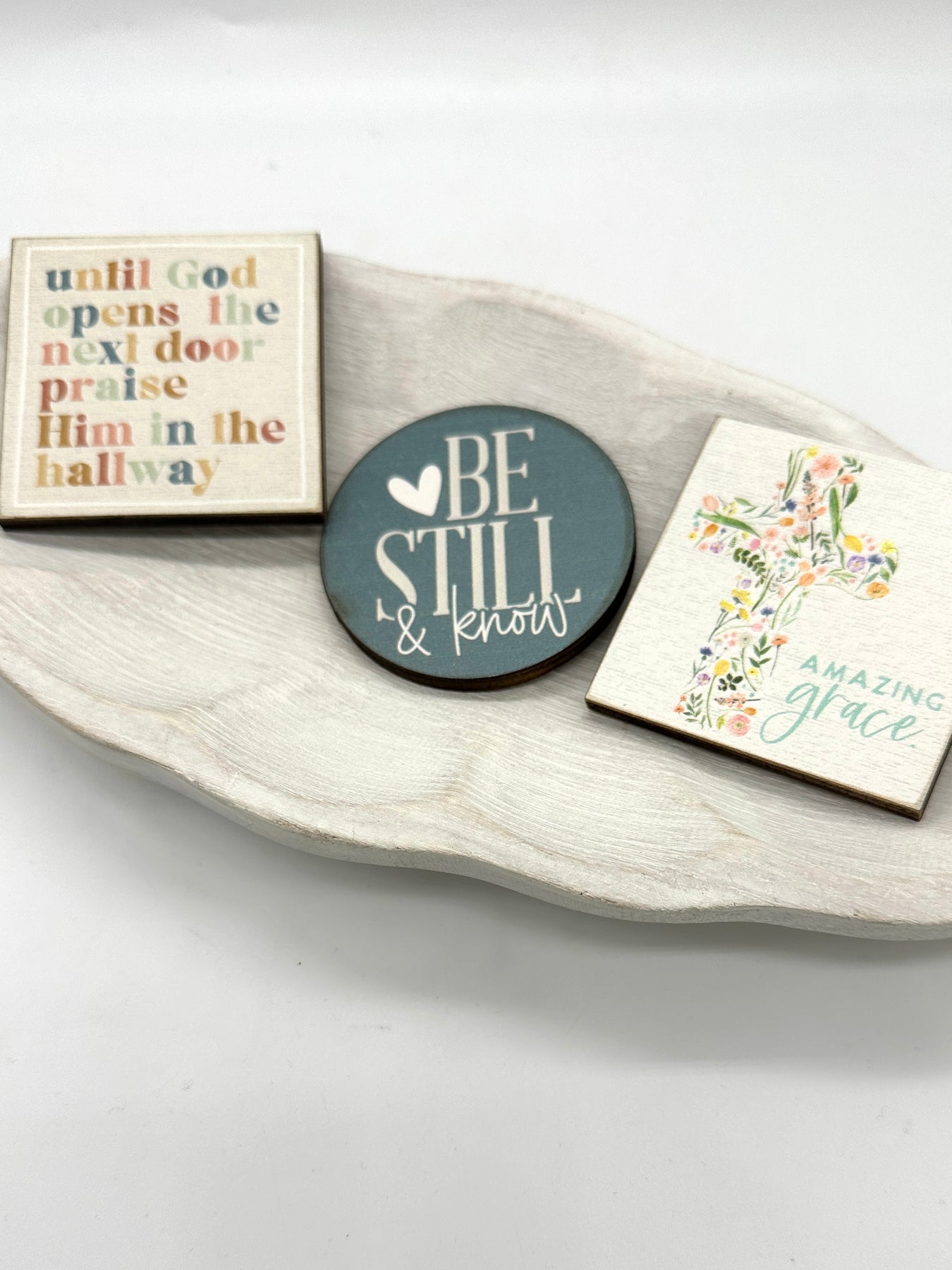 Available Sayings-Be Still & Know (Teal), Amazing Grace (Green), Until God opens the next door, praise Him in the hallway (Multi)