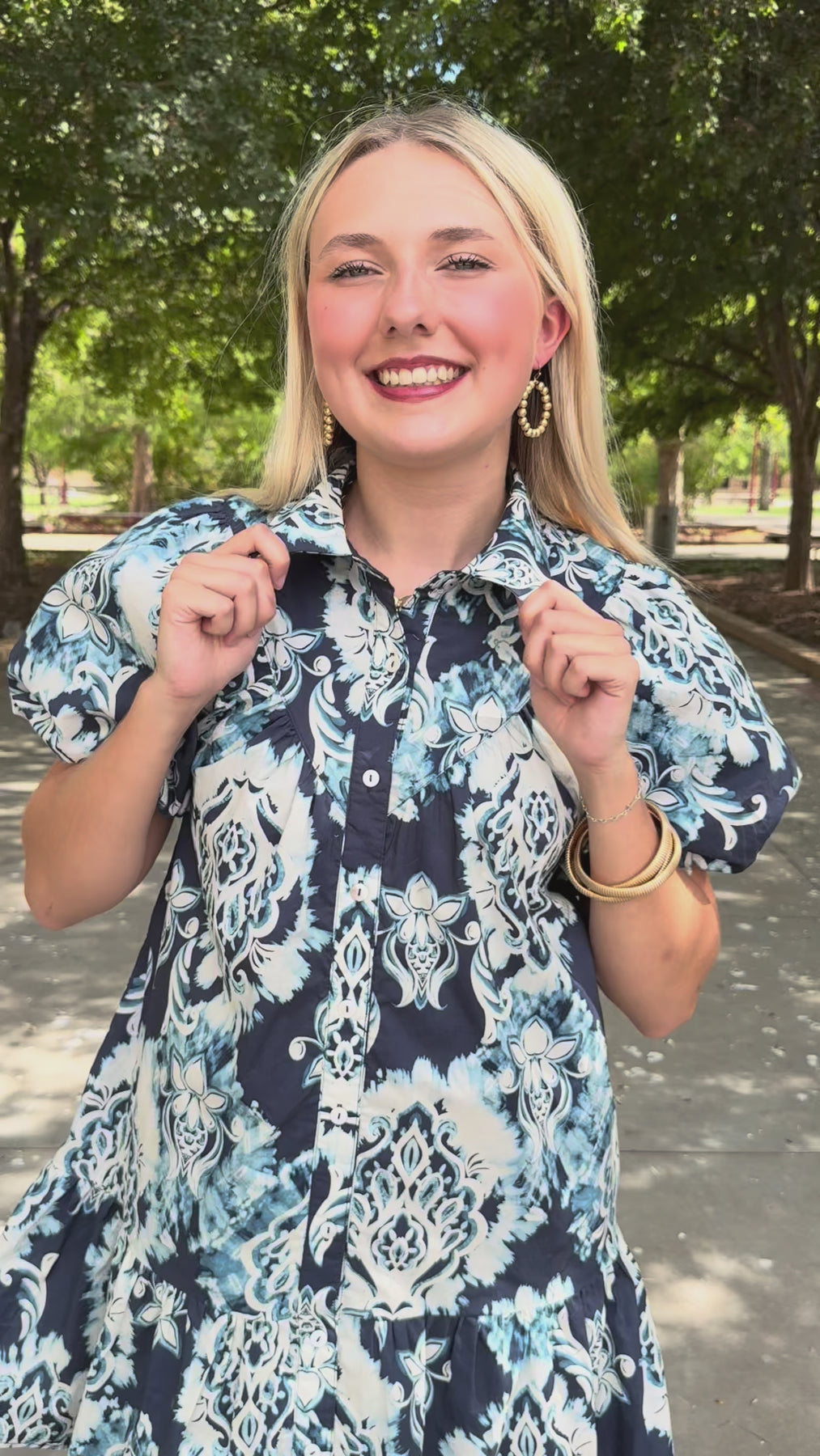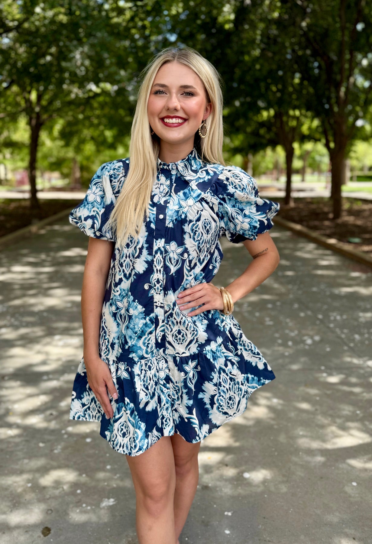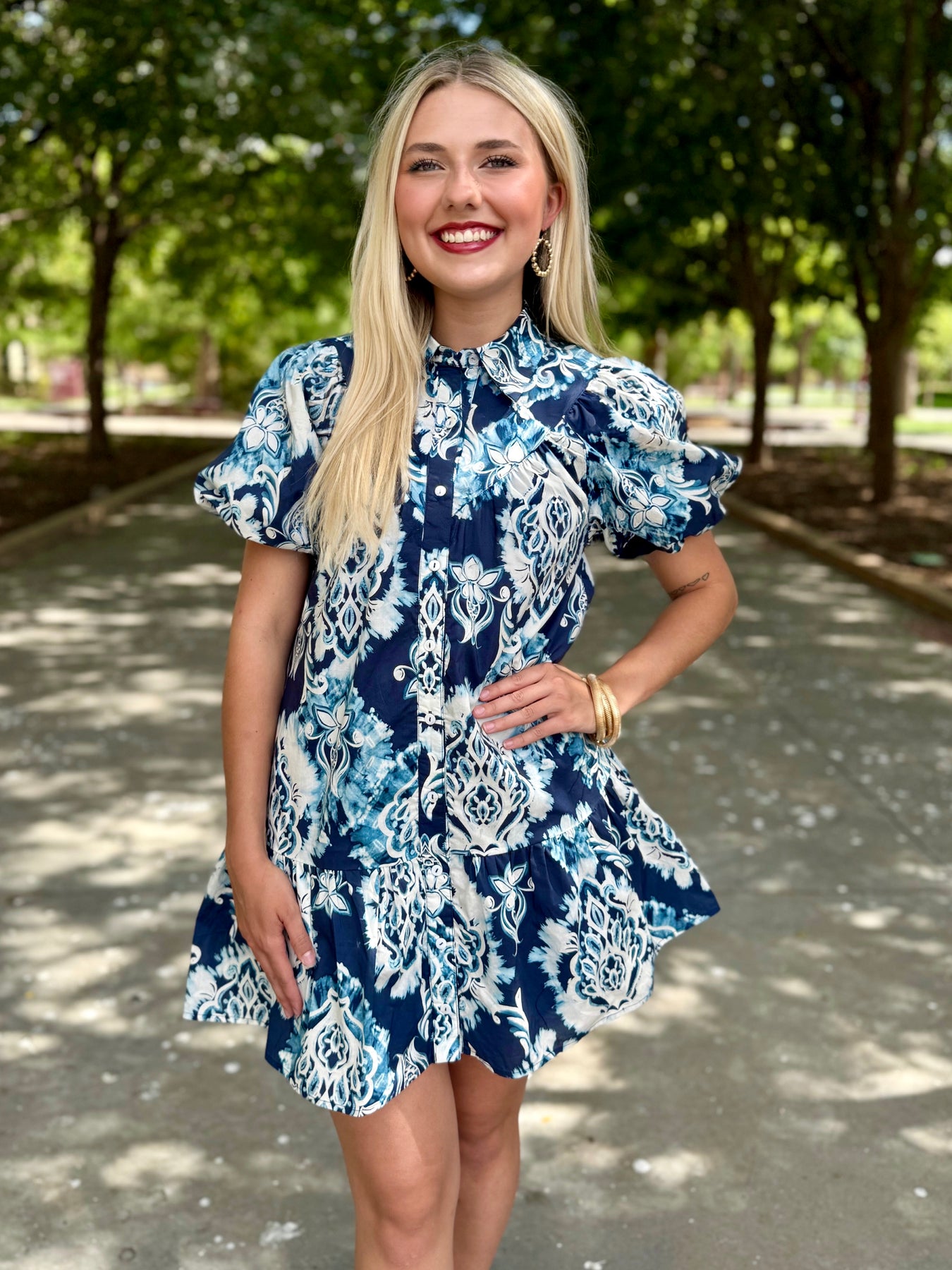 This Navy Perfection Dress is Full Of Charm! We love the print, puff sleeves and button down detailing. It's fully lined with pockets for great functionality. Pair this stunning dress now with your favorite wedges for church and wear with booties and a denim jacket when the temps drop.